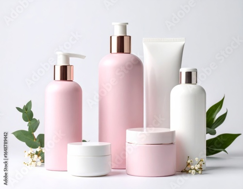 Pink cosmetic bottles and tubes for hygiene, beauty, and spa care are isolated on a white background