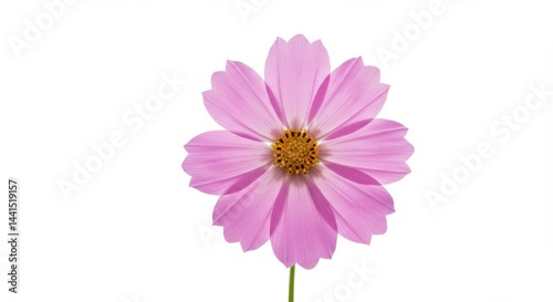 cosmos, flower, pink, bloom, blossom, floral, plant, beauty, nature, stem, isolated, delicate, bright, summer, spring, single, with, yellow, center, against, white, background, full, vibrant, colours, slender, green, art, design, digital, modern, creative