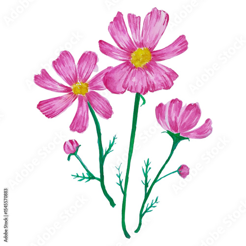 Pink cosmos watercolor painting isolated on transparent background