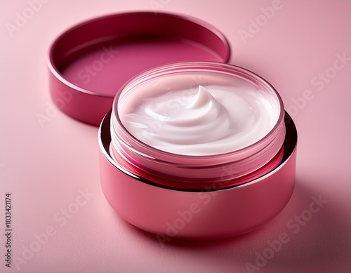 pink cream jar with white cream on a pink background