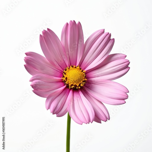 Pink daisy with yellow center, isolated on white background. Delicate petals and green stem. Macro shot shows fine details of the blossom, ideal for spring or summer themes.
