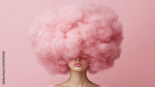 Pink Dream: A captivating portrait of a woman obscured by a fluffy cloud of cotton candy pink, symbolizing whimsy, ethereal beauty, and the boundless imagination of the human spirit.