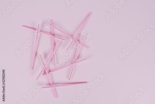 Pink eyelash brushes on a pink background with copyspace