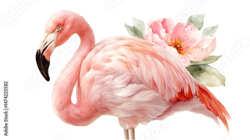 flamingo, pink flamingo, peony, watercolor, flower, floral, bird, artwork, art, illustration, painting, nature, animal, tropical bird, summer, spring, pink, delicate, elegant, beautiful, vibrant, design element, graphic, background, texture, pattern, card, invitation, wedding, greeting card, poster, print, booklet, advertisement, website, banner, decoration, digital artwork, pink flower, tropical flower, feminine, romantic
