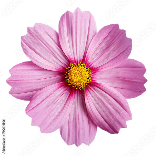 Pink flower with vibrant petals and yellow stamens, isolated on white