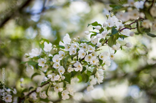Pink flowers and bud of Wild Apple tree. Spring background with Apple tree blossom.