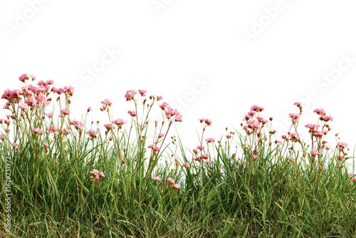 flower, pink, grass, green, border, plant, nature, meadow, spring, summer, flora, bloom, vibrant, detail, closeup, isolated, white, background, horizontal, natural, garden, landscape, growth, beauty, fresh, high-coloured, closeup, detailed, borderline, naturalistic, photo, floral, grassy, edge, textured, vegetation, springtime, soft, pastel
