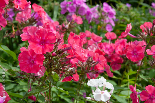 Pink flowers. Phlox paniculata. Blooming phlox surrounded by other colorful flower bushes. Pink phlox flower close up for background, post, screensaver, wallpaper, postcard, banner, cover, website