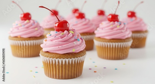 Pink Frosted Cupcakes with Cherries and Sprinkles pink frosting