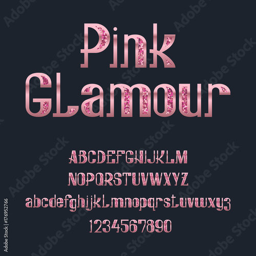 Pink Glamour typeface. Glittering rose font. Isolated ornate english capital and lowercase letters alphabet with numbers.