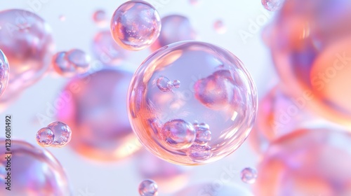 Pink iridescent bubbles floating, light background, cosmetic ad
