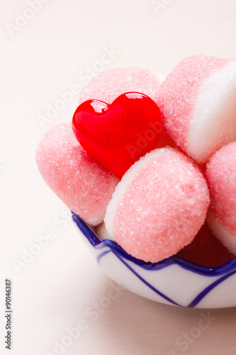 Pink jellies or marshmallows with sugar in bowl
