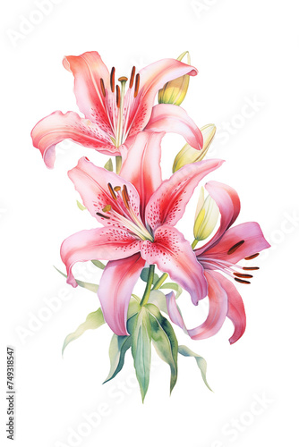 flower, pink, lily, watercolor, illustration, botanical, stamen, flower petals, bloom, delicate, flora, detailed, plant, artwork, painting, nature, beautiful, elegance, pistil, pollen, floral, art, perennial, bright, green, leaf, stem, soft, colours, closeup, blossom, vibrant, textured, creative, ornamental, decorative, garden, spring, summer, horticulture, naturalistic, watercolor