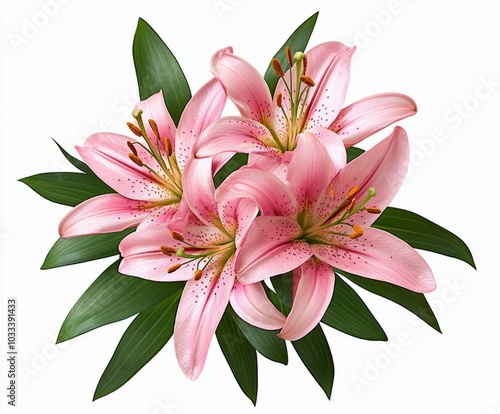 Pink lily flowers and green leaves in a floral arrangement isolated on white or transparent background