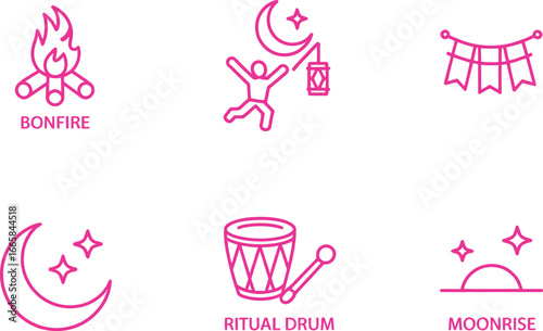 Pink Line Icon Set with Bonfire, Celebration, Moonrise, and Ritual Drum Designs