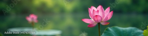 Pink lotus flower with a delicate stem in a serene lake, natural scenery, soft light