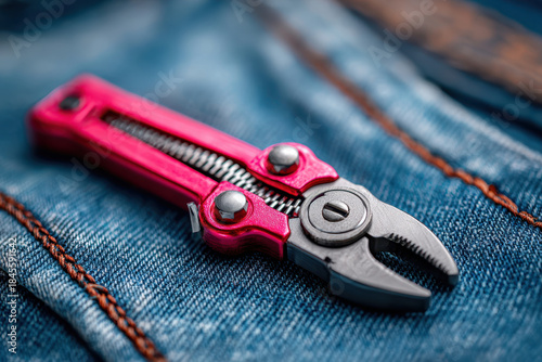 plier, pink, denim, closeup, tool, craftsmanship, repair, equipment, hardware, utility, fashion, accessory, lifestyle, detailed, macro, metal, engineering, bricolage, home improvement, practical, vibrant color