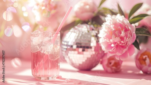 pink non alcoholic cocktail with pink straw disco ball with pink peonies in the background, pink party