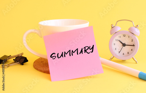Pink paper with the text SUMMARY on a white cup. Clock, pen on a yellow background.
