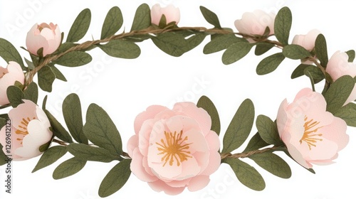 Pink peonies dreamy femininity gardening petal. A delicate floral wreath featuring soft pink flowers and green leaves, perfect for decor or accessories.