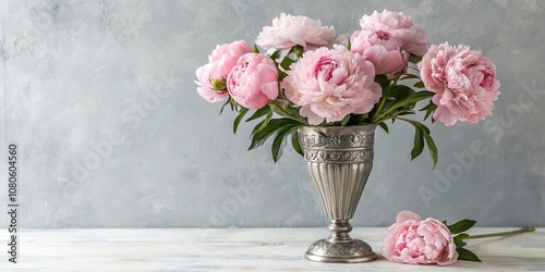 Pink peony blooms in a elegant silver vase against a soft gray background, sophisticated look, silver vase