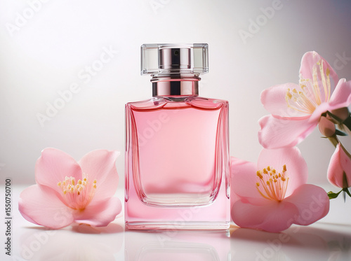 Pink perfume bottle on a white background, soft and elegant. No extra details — minimalist composition, gentle lighting, and a clean, luxurious aesthetic.