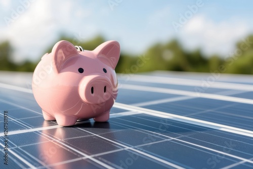 Pink piggy bank on solar panels symbolizing energy savings and renewable investment