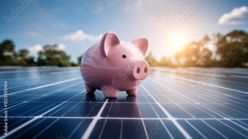 Pink piggy bank on solar panels with bright sun, blue sky, and trees in the background; concept of generating electricity.