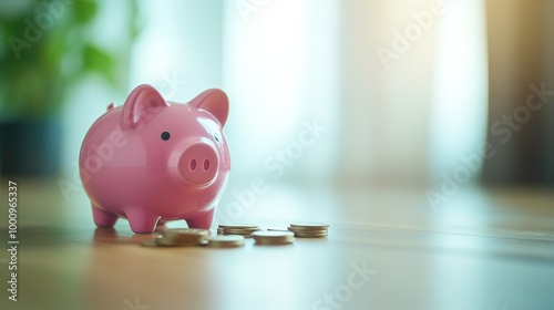 Pink piggy bank with coins on wooden floor, natural green blur background, perfect for copy space