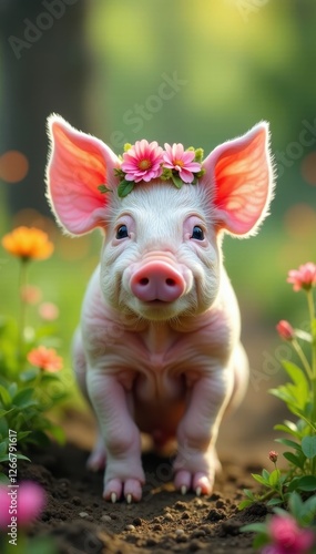 Pink piglet with floral crown, idyllic farm scene, pet, farm
