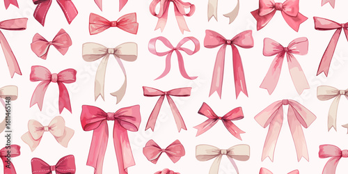 Pink ribbon bow seamless pattern. Watercolor cute romantic decor, girl birthday baby shower print vector design