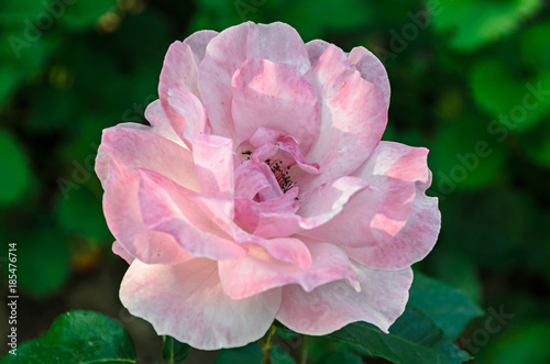 Pink rose flowers, green branch plant, bokeh background