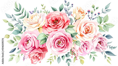 Pink roses on white background, Set of watercolor flowers, Clipart watercolor flowers