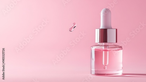 Pink serum bottle, dropper, falling drop, pastel background, beauty ad