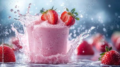 Pink strawberry smoothie with splashing water.