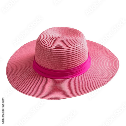 Pink sun hat isolated on white background. Fashionable wide brim beach hat for summer fashion, vacation, travel, lawn party, barbecue, bbq, UV protection, sun protection. Beach day essentials.