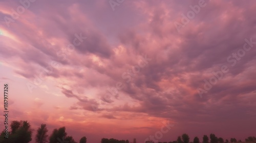 sky, cloud, sunset, pink, purple, red, orange, horizon, tree, silhouette, evening, dusk, twilight, atmosphere, colours, nature, weather, picturesque, scenic, beautiful, majestic, dramatic, vibrant, calming, peaceful, serene, tranquil, moody, soft, gentle, light, shadow, landscape, background, texture, art, image, photograph, view, scenery