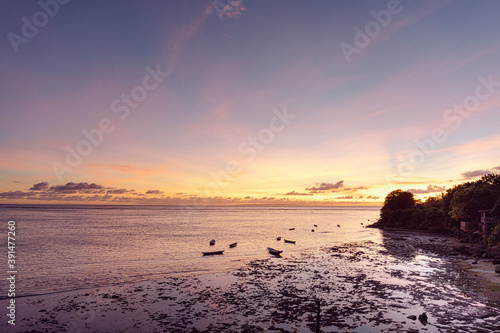 Pink sunset on the ocean on a tropical beach in Bali with small fishing boats