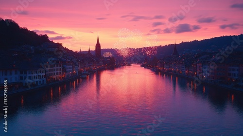 sunset, river, town, city, fireworks, pink, purple, sky, water, building, house, light, evening, night, twilight, calm, serene, peaceful, romantic, magical, picturesque, beautiful, stunning, scenic, landscape, city landscape, travel, vacation, holiday, celebration, festive, europa, german, architecture, historic, charming, idylli, vibrant, colours, image, photo, art, artwork, view