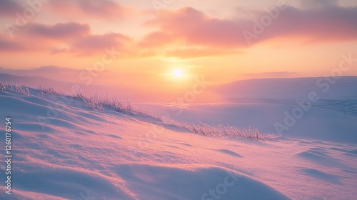 sunset, sunrise, winter, snow, mountain, landscape, pink, sky, cloud, cold, frost, ice, nature, scenic, beautiful, serene, peaceful, tranquil, calm, quiet, stillness, light, glow, gold, orange, purple, horizon, hill, field, wilderness, view, scene, majestic, awe, wonder, picturesque, breathtaking, huge, expansive, glacé, barren, desolate