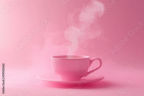 Pink teacup with steam on pink background. Ideal for blogs, websites, or social media showcasing calmness and serenity.
