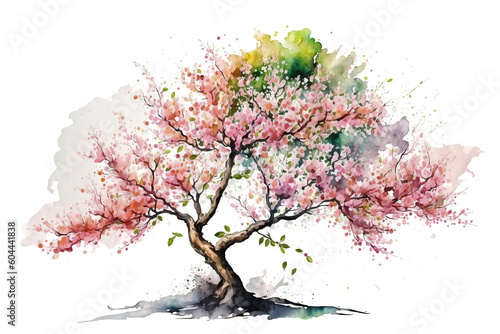 tree, blossom, pink, watercolor, paint, drawing, vignetting, beautiful, colourful, spring, bloom, nature, leaf, single, isolated, white, illustration, ai, tree branch, season, design, plant, flower, silhouette, art, green, decoration, floral, cherry, wood, sakura