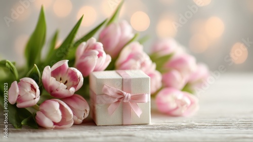 Pink tulips in glass bowl on white table, soft daylight, fresh spring floral home decor scene