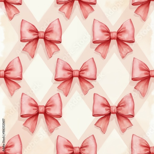 Pink watercolor bows repeat in a seamless pattern on a cream and light brown chevron background. This soft decorative design is great for invites or scrapbooking.