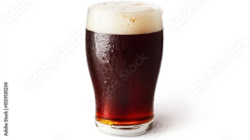 Pint of rich, dark porter beer with foam settling on top, isolated on white background