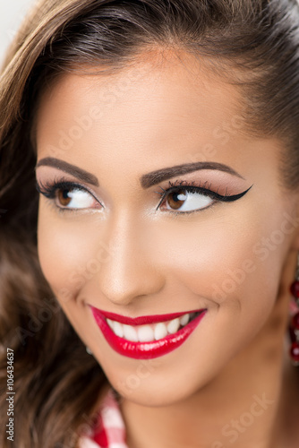 woman, beautiful, make up, fashion, eyeliner, red, lip, portrait, face, beauty, model, girl, glamour, sensuality, elegance, attractive, vertical, closeup, macro