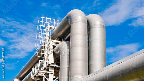 pipeline close-up against blue sky and clouds view from below
