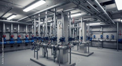 pipe, piping, gauge, valva, fitting, flange, connection, industrial, mechanical, plumbing, system, pressure, equipment, machine, metal, steel, duct, ventilation, room, interior, building, infrastructure, facility, structure, engineering, technology, factory, boiler, heating, cooling, plant, control, maintenance, repair, distribution, supply, underground, complex, indoor, horizontal, silver, blue, red, grey, energy, utility, service, generation