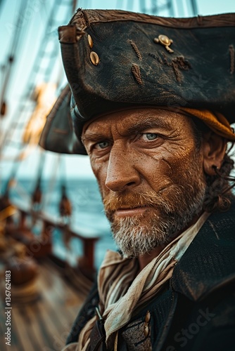 adventure, sea, ocean, evil, dangerous, battle, command, sailor, sailing, captain, ship, caucasian, exploration, explore, explorer, hat, head shot, outdoors, person, pirate, pirate, travel, villain, ai