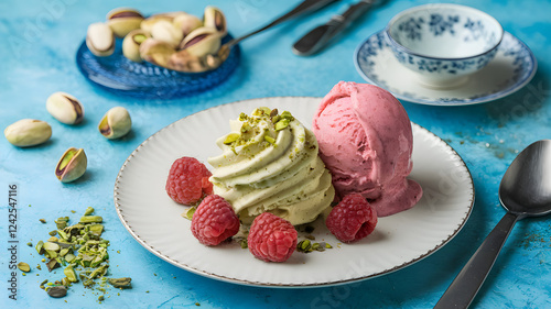 pistachio, cream, raspberry, ripple, ice, dessert, berry, tart, sweet, creamy, summer, swirl, fruity, refreshing, epicure, artisanal, indulgence, texture, contrast, vibrant, vegan, nostalgia, silky, balance, parfait, receipe, nutty, seed, jam, luxury, chilled, organic, natural, medley, scoop, cone